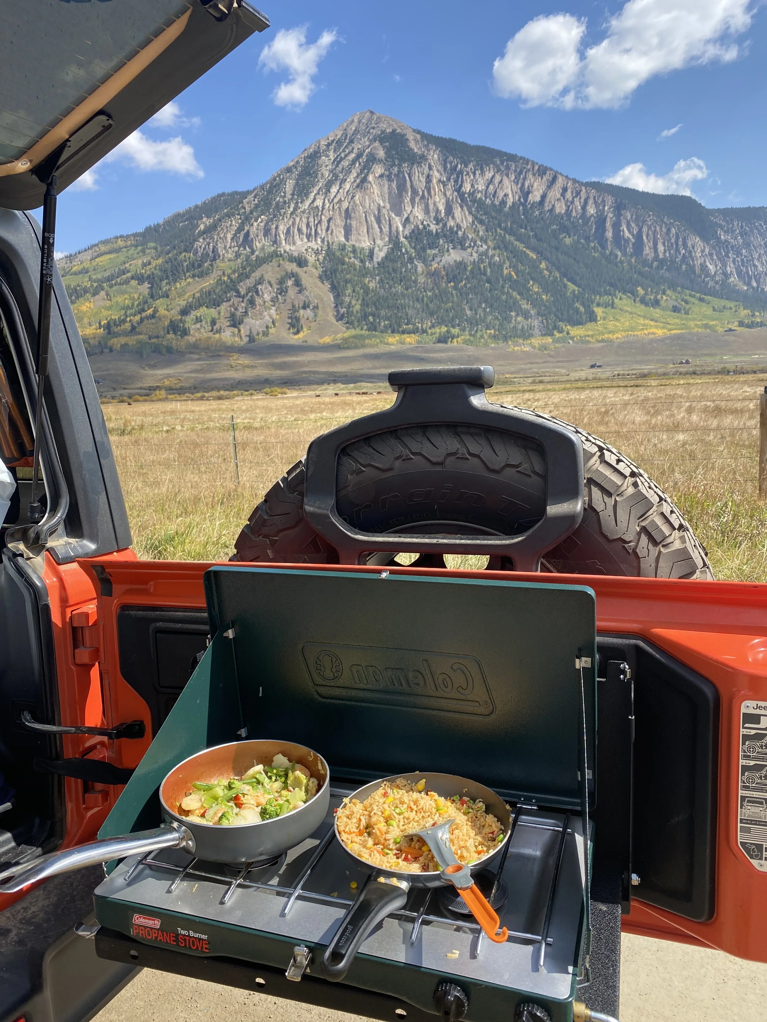 I actually cooked most meals, or we ate sandwiches. I had a powered fridge in the back of the Jeep that did an amazing job at keeping things nice and cold, some things at the bottom even froze! I cooked a lot of stir fry in my two-burner stove.